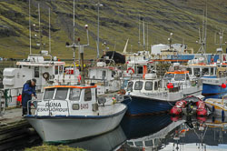 Diese Aufnahme zeigt den Hafen des kleinen Fischerortes Eskifjörður in den Ostfjorden Islands. Von hohen Bergen umgebenen liegt Eskifjörður am Ende des gleichnamigen Fjordes, der vom größeren Reyðarfjörður abzweigt. Der Ort war ab 1789 ein ...