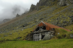 Eine alte Hütte duckt sich an die Berghänge entlang der Küste der dünn besiedelten Ostfjorde. Wind und Wetter haben ihr im Laufe der Zeit ...