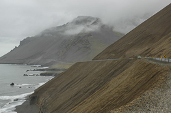 An steilen Hängen vorbei windet sich die Ringstraße hinter Höfn nordostwärts. Tunnel gibt es auf dem Weg nach Egilsstaðir am See Lagarfljot (Lögurinn) nur wenige. Die Fahrt entlang der Fjorde bis ins Zentrum von Islands Osten ist daher recht ...