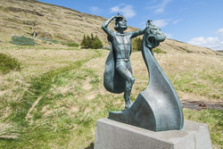 Zwischen den Wikinger-Ruinen und einer Rekonstruktion eines Langhauses steht diese Statue von Erik dem Roten, der in Eiríkstaðir im 10. Jahrhundert seinen Hof ...
